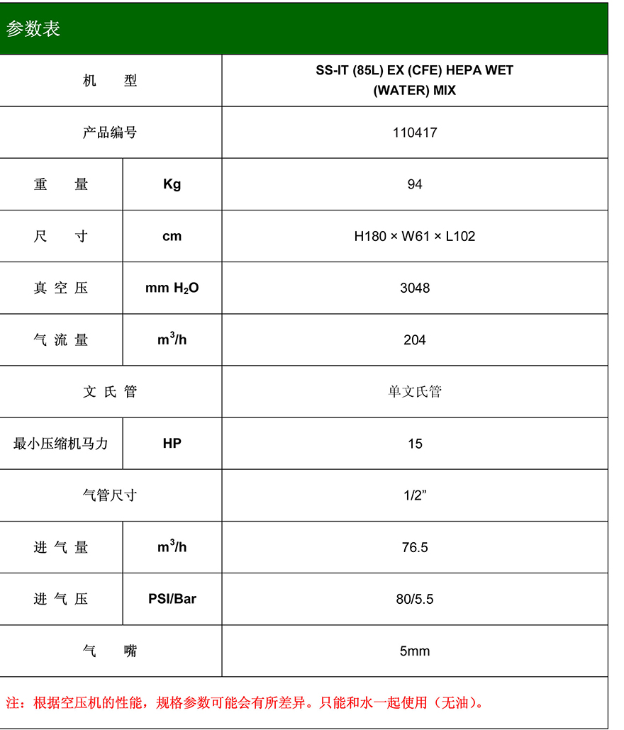 使用液體浸浴來吸塵,液體浸浴“濕(水)混合”—意味著只能和水一起使用(無油)。